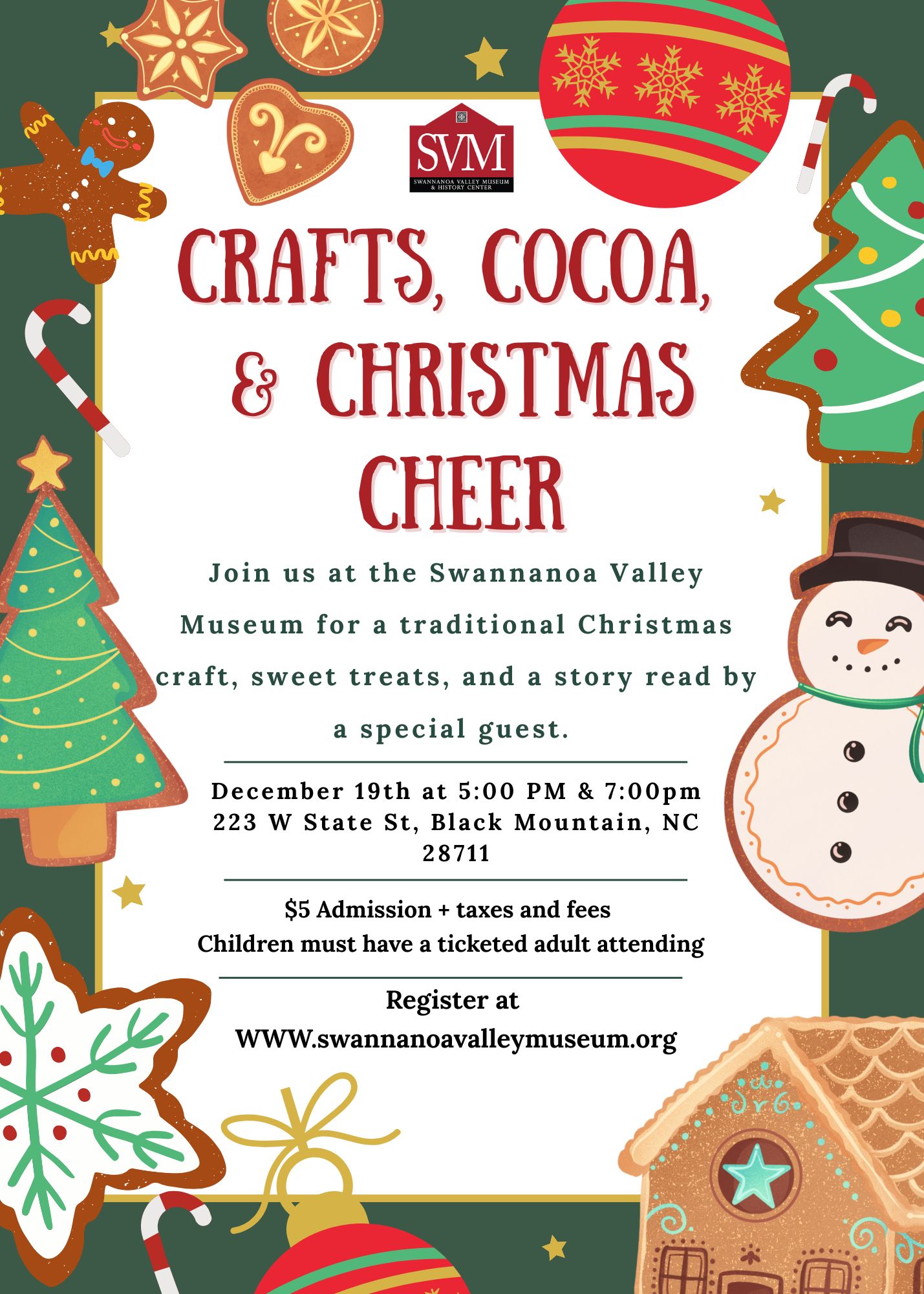 Join us at the Swannanoa Valley Museum for an evening filled with festive family fun! During Crafts, Cocoa, & Christmas Cheer, kids will create a traditional Christmas craft, write a postcard to Santa, enjoy sweet holiday treats, and listen to a Christmas tale read by a special guest.