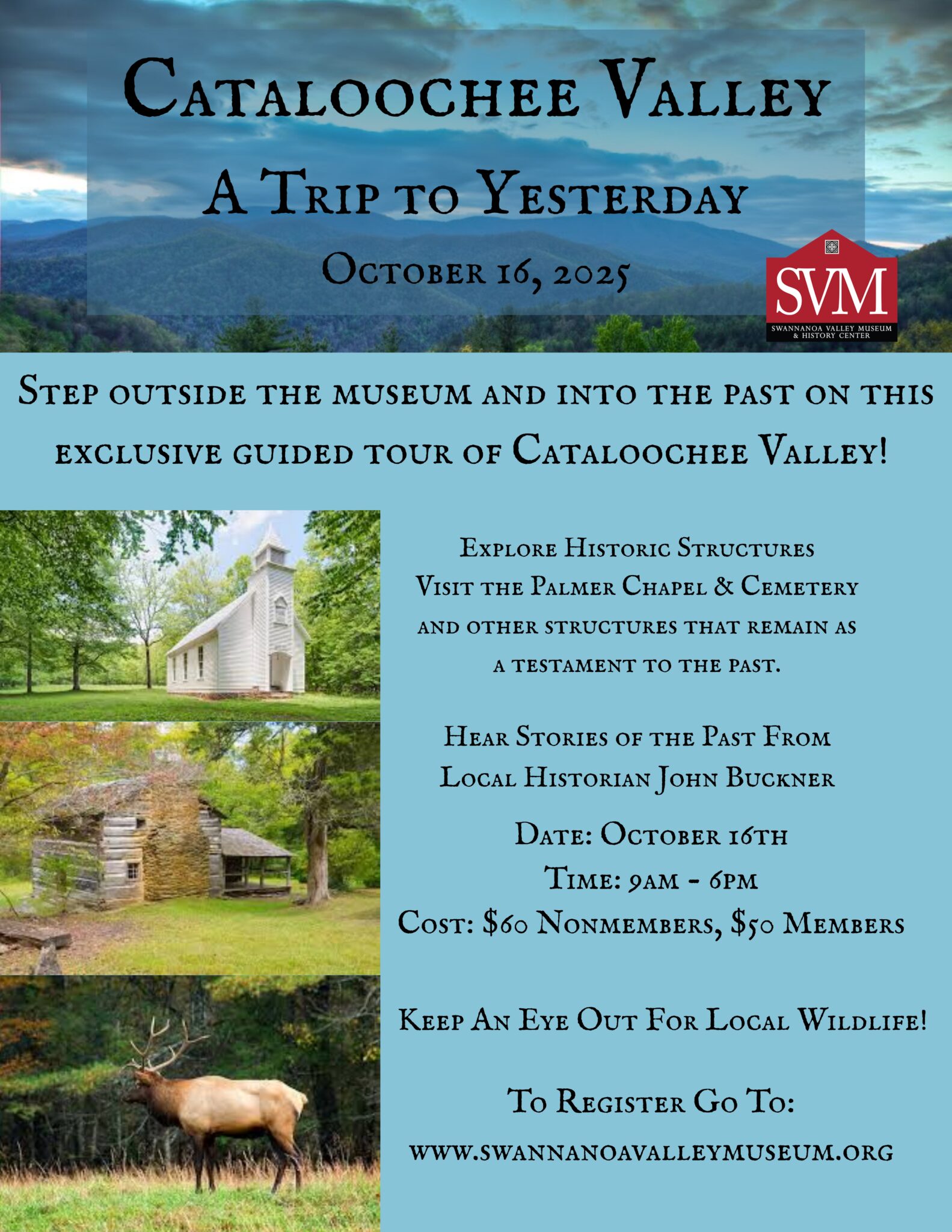 Step outside the museum and into the past on this exclusive guided tour of Cataloochee Valley! Explore historic structures like the Palmer Chapel & Cemetery that remain as a testament to the past. Hear Stories of the Past from local historian John Buckner. Keep an eye out for local wildlife! (Elk Season)